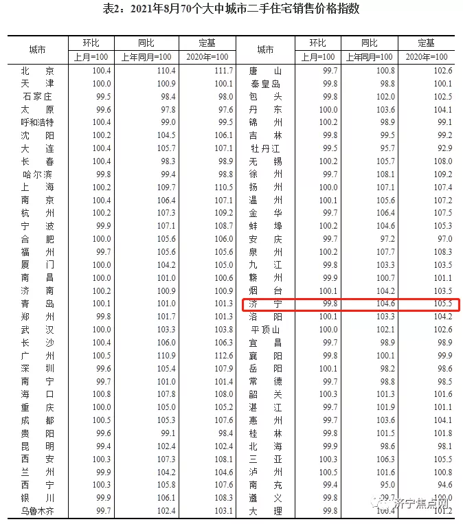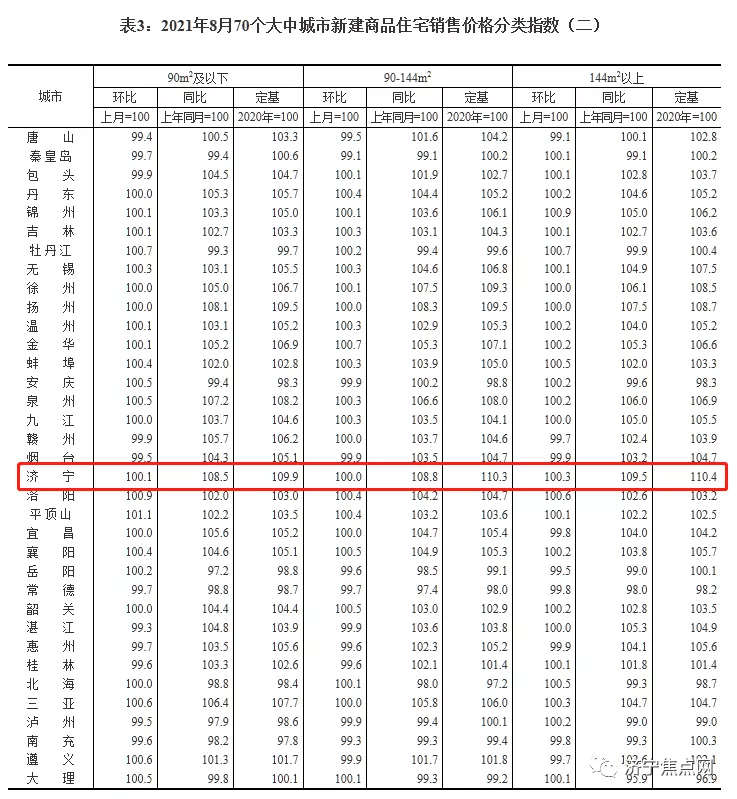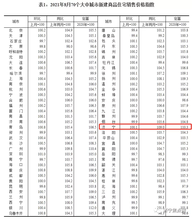 国家统计局今早9点30分发布了2021年8月份70个大中城市商品住宅销售价格变动情况统计数据。2021年8月份济宁新建商品住宅销售价格环比上涨0.1%。