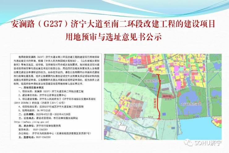 近日,搜狐网济宁小编相关渠道获悉:安澜路(G237)济宁大道至南二环段改建工程的建设项目用地预审与选址意见书已公示,具体如下。