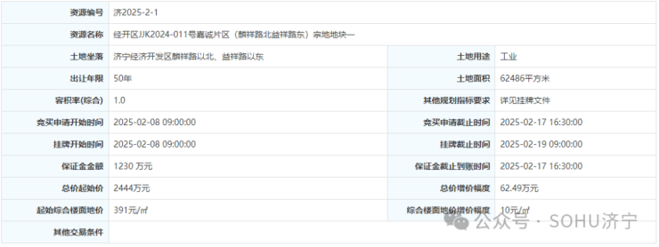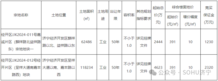 土地位于:济宁经济开发区麟祥路以北、益祥路以东;土地面积:62486㎡(约94亩);土地用途:工业用地;出让年限:50年;容积率不小于1.0;起始价:2444万元,综合楼面价起价:391元/㎡;