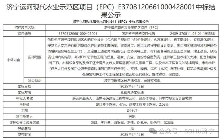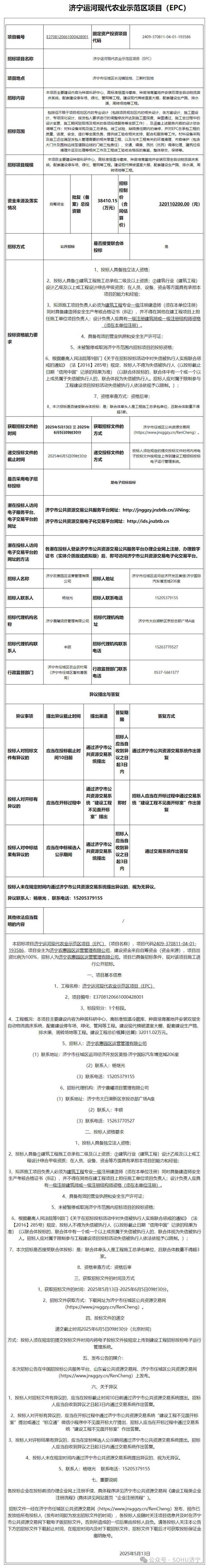2025年7月14日,搜狐网济宁小编了解到:济宁市自然资源和规划局收到济宁农惠园区运营管理有限公司关于济宁运河现代农业示范区项目的建设用地规划许可申请,根据《中华人民共和国城乡规划法》《山东省城乡规划条例》等法律法规和国家、省有关规定,经审核,该建设用地符合国土空间规划和用途管制要求,现对核发该项目建设用地规划许可进行批前公告,如有意见或建议,请在公告期内及时反馈至济宁市自然资源和规划局,公告期限内若无异议,将依法核发该项目用地规划许可证。
