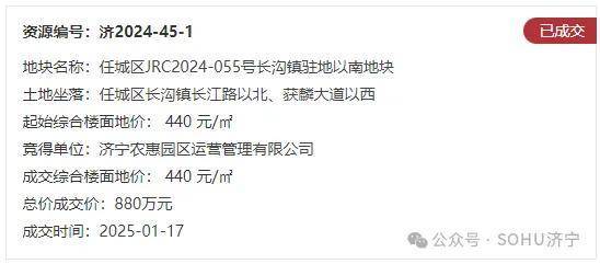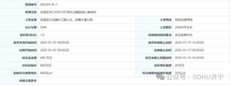 土地位于:任城区长沟镇长江路以北、获麟大道以西;土地面积:20000㎡(约30亩);土地用途:物流仓储用地;出让年限:50年;容积率不小于1.0;起始价:880万元,综合楼面价起价:440元/㎡;最终成交价为:880万元(约29万元/亩),综合楼面地价成交价:440元/㎡;溢价率:0.0%;