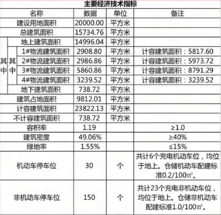 规划建设用地面积为20000平方米,总建筑面积15734.76平方米,其中地上建筑面积14996.04平方米,地下建筑面积738.72平方米;容积率1.19,建筑密度49.06%,绿化率1.55%,机动车停车位共30个,非机动车停车位150个。