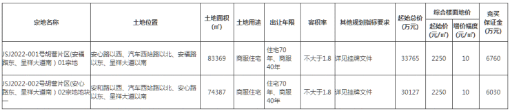 土地位于:安和路以西、汽车西站路以北、安心路以东、呈祥大道以南;土地面积:74387㎡(约112亩);土地用途:商住用地;出让年限:商服40年、住宅70年;容积率不大于1.8;起始价:30127万元,综合楼面价起价:2250元/㎡;最终成交价为:30127万元(约269万元/亩),综合楼面地价成交价:2250元/㎡;溢价率:0.0%;