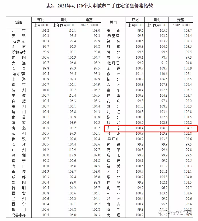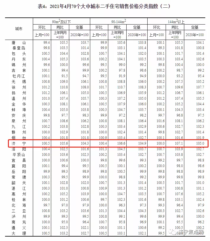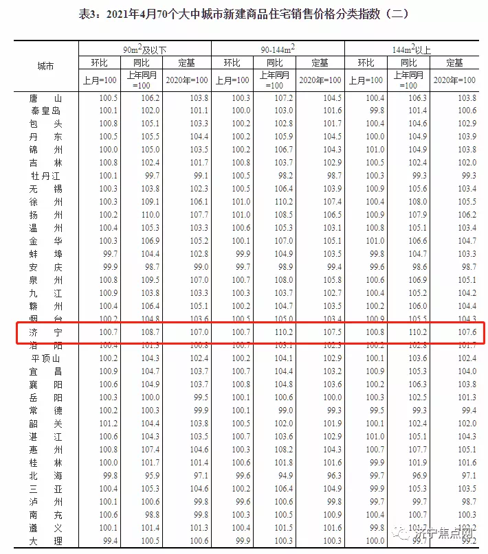 国家统计局今早9点30分发布了2021年4月份70个大中城市商品住宅销售价格变动情况统计数据。2021年4月份济宁新建商品住宅销售价格环比上涨0.7%。