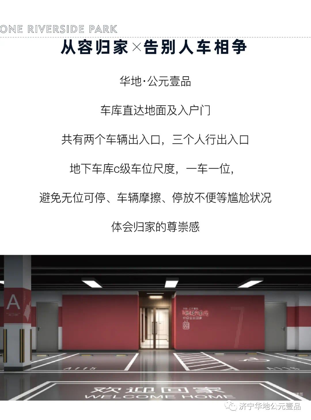 济宁华地公元壹品,车库直达地面及入户门。共有两个车辆出入口,三个人行出入口。地下车库C级车位尺度,一车一位,避免无位可停、车辆摩擦、停放不便等尴尬状况,体会归家的尊崇感。