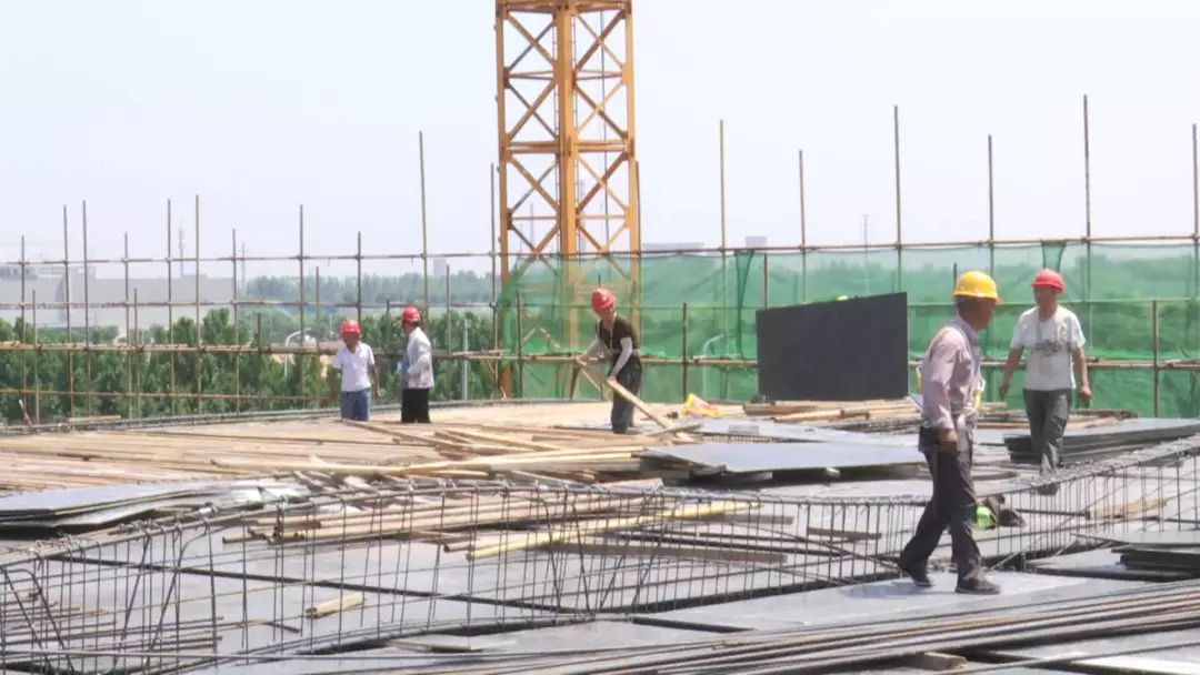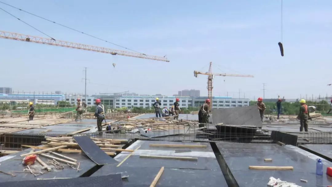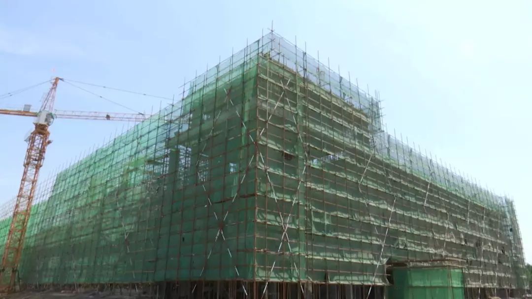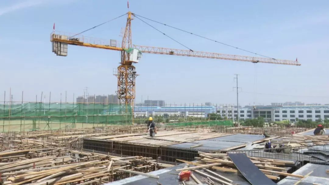 施工现场 ,工人师傅们正搭设钢架、墙体填充,高耸的塔吊机在繁忙有紊的运送建材,建设现场紧张有序。