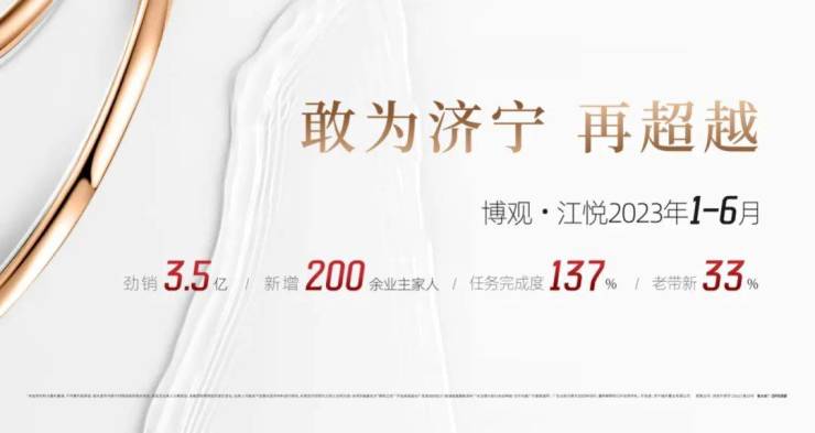 2023年1~6月,博观·江悦劲销3.5亿,任务完成度137%,老带新33%,新增200余新业主,这是独属于博观·江悦的红盘实力与热销锋芒。