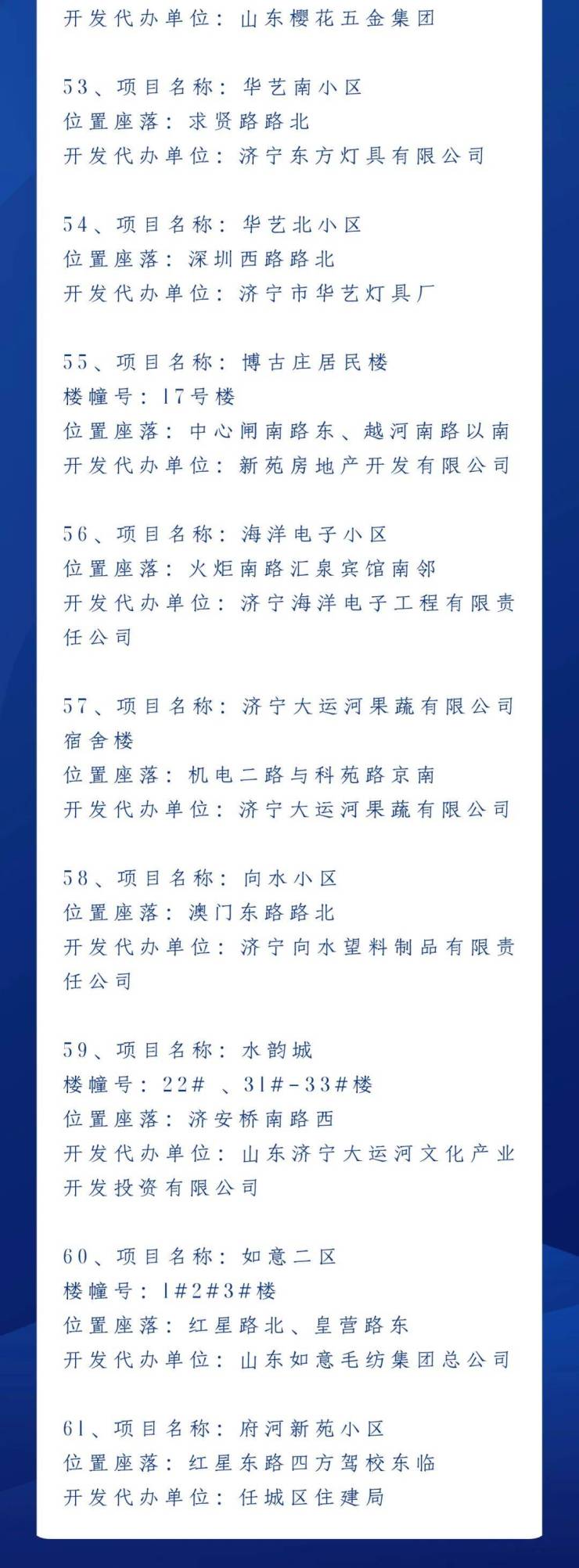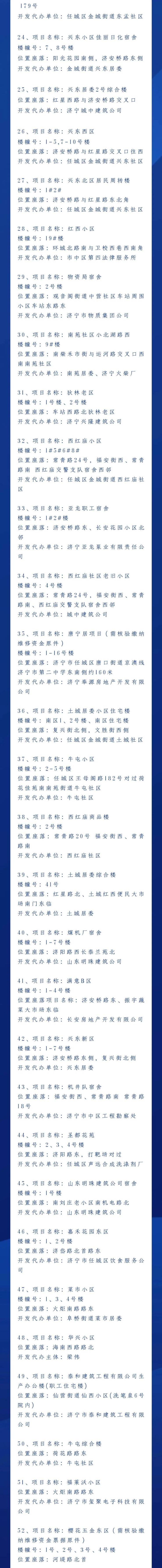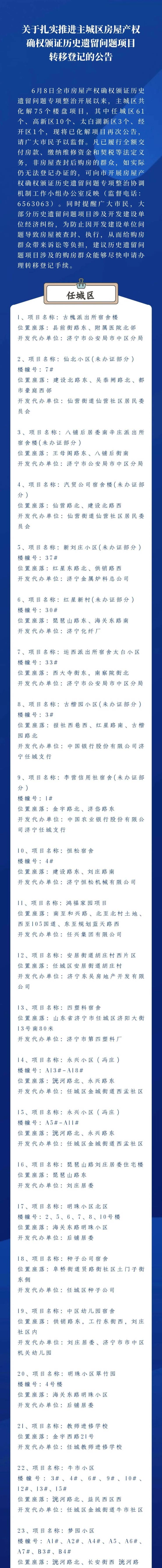 6月8日全市房屋产权确权颁证历史遗留问题专项整治开展以来,主城区共化解75个楼盘项目,其中任城区 61个、高新区10个、太白湖新区3个、经开区1个,现将已化解项目再次公告,请广大市民予以监督。凡已履行全额交付房款、缴纳维修资金和契税等法定义务