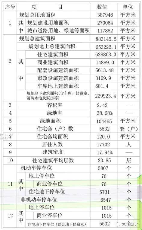 地块规划建设用地面积27.01公顷(约405亩);总建筑面积:883145.5㎡;其中地上建筑面积为653222.1㎡,地下建筑面积229923.4㎡;容积率为2.42;建筑密度17.94%;绿地率38.68%;计划总居住户(套)数为5532户(套),居住人数约17702人(按3.2人/户预算);建筑类型包括住宅、商业、配套设施等;规划机动车停车位5807个,非机动车位6547个。