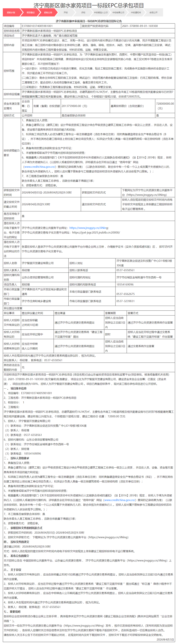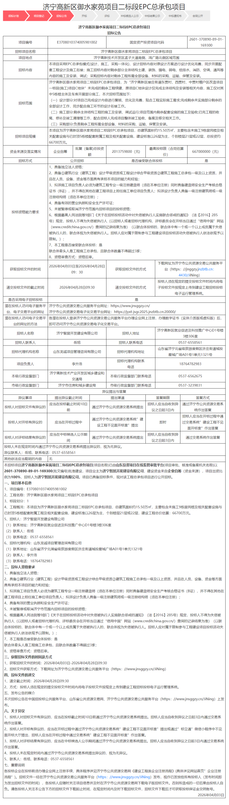 本招标项目济宁高新区御水家苑项目二标段EPC总承包项目(项目名称)已由山东投资项目在线监管审批平台(项目审批、核准或备案机关名称)以2601-370890-89-01-169300(批文编号)批准建设,项目业主为济宁智居开发建设有限公司,建设资金来自企业自筹(资金来源),项目出资比例为100%,招标人为济宁智居开发建设有限公司。项目已具备招标条件,现对该工程总承包项目进行公开招标。