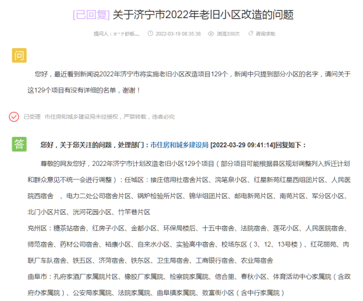 近日,搜狐网济宁小编注意到济宁市网络问政平台上有网友提问:最近看到新闻说2022年济宁市将实施老旧小区改造项目129个,请问关于这129个项目有没有详细的名单?