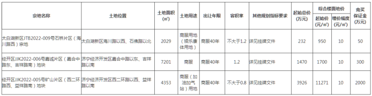 济宁城区继续土拍!搜狐网济宁小编从济宁市自然资源和规划局了解到:经济宁市人民政府批准,济宁市自然资源和规划局决定以网上挂牌方式出让太白湖新区1宗、济宁经开区2宗国有建设用地使用权,土地用途均为商服用地;土地面积13583㎡,约20亩;起始价为5628万元。经竞价后,最终成交价为5628万元。