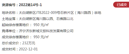 土地位于:太白湖新区海川路以西、石佛路以北;土地面积:2029㎡(约3亩);土地用途:商服用地(娱乐康体用地);出让年限:40年;容积率不大于1.2;起始价:232万元,综合楼面价起价:950元/㎡;最终成交价为:232万元(约77万元/亩),综合楼面地价成交价:950元/㎡;溢价率:0.0%;