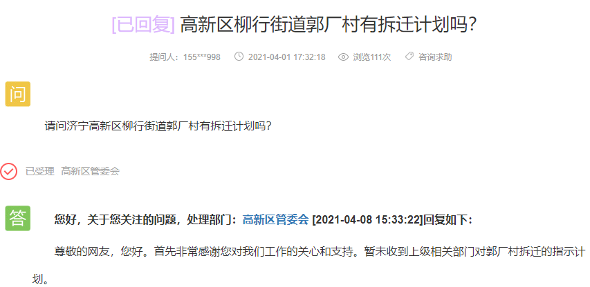 网友提问: 请问济宁高新区柳行街道郭厂村有拆迁计划吗?