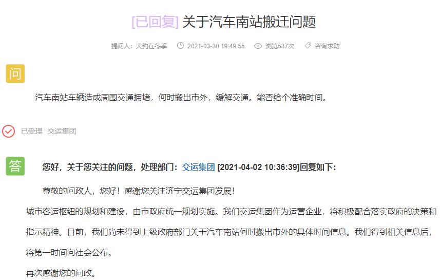交运集团回复:城市客运枢纽的规划和建设,由市政府统一规划实施。我们交运集团作为运营企业,将积极配合落实政府的决策和指示精神。目前,我们尚未得到上级政府部门关于汽车南站何时搬出市外的具体时间信息。我们得到相关信息后,将排名前列时间向社会公布。