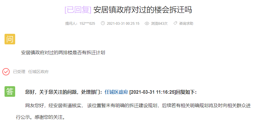任城区政府回复:经核实,安居街道暂未收到相关拆迁通知,目前无拆迁计划。感谢您的关注。