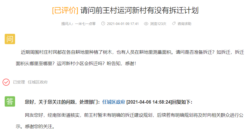 任城区政府回复:经南张街道核实,前王村暂未有明确的拆迁建设规划,后续若有明确规划将及时向相关群众进行公示。感谢您的关注。