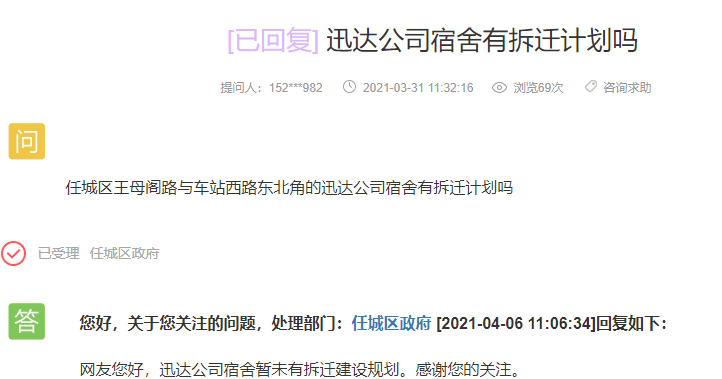 网友提问:任城区王母阁路与车站西路东北角的迅达公司宿舍有拆迁计划吗?