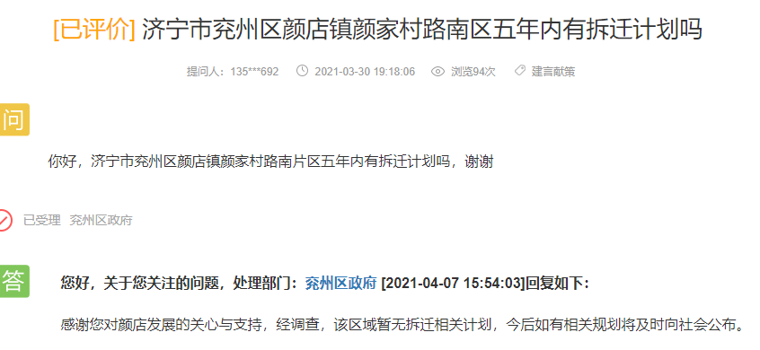 网友提问: 你好,济宁市兖州区颜店镇颜家村路南片区五年内有拆迁计划吗,谢谢。