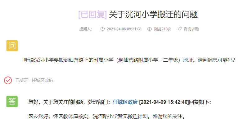 任城区政府回复:经区教体局核实,洸河路小学暂无搬迁计划。感谢您的关注。