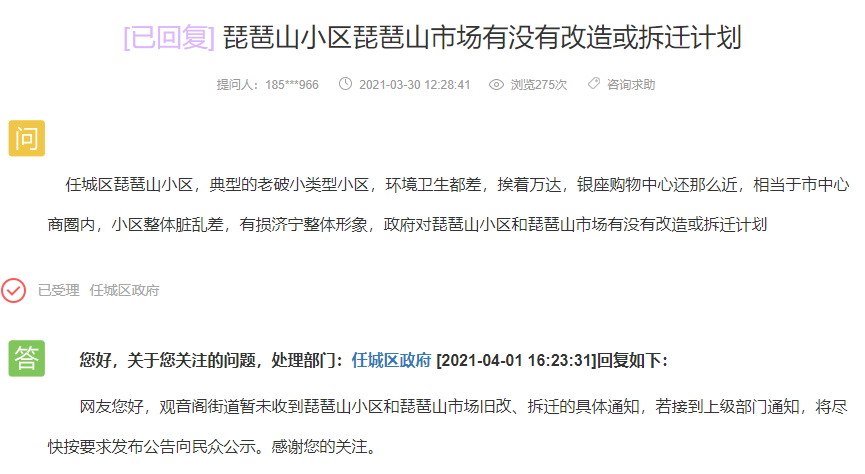 任城区政府回复:观音阁街道暂未收到琵琶山小区和琵琶山市场旧改、拆迁的具体通知,若接到上级部门通知,将尽快按要求发布公告向民众公示。感谢您的关注。