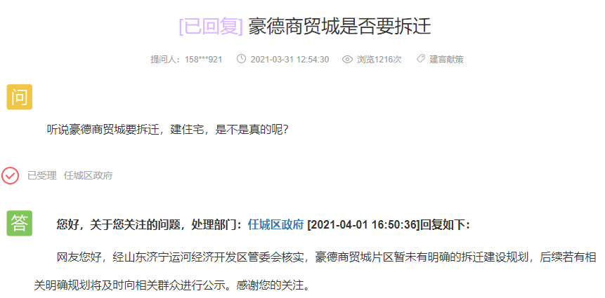 任城区政府回复:经山东济宁运河经济开发区管委会核实,豪德商贸城片区暂未有明确的拆迁建设规划,后续若有相关明确规划将及时向相关群众进行公示。感谢您的关注。