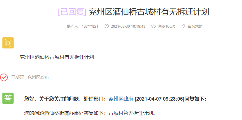 兖州区政府回复:古城村暂无拆迁计划。