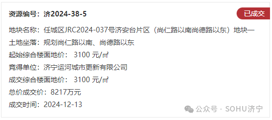 任城区政府在任城区JRC2024-043号金宇片区(岱庄南路东枫杨路南)地块中回购商业用房用于安置黎寨村,以3100元/平方米价格回购安置商业用房约1900平方米。受让人签订出让合同时一并与任城区政府签订回购协议。
