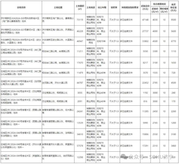 从该宗地块的具体分布上看,济宁高新区2宗、任城区11宗、济宁太白湖新区1宗。从土地用途来看,10宗商住用地、3宗商业用地、1宗住宅用地。土地总面积为398853㎡,约598亩;总起始价为204995万元。