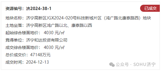 土地位于:济宁高新区鸿广路以北、康泰路以西;土地面积:73119㎡(约110亩);土地用途:城镇住宅用地兼容商业用地;出让年限:住宅70年、商业40年;容积率不大于1.6;起始价:47148万元,综合楼面价起价:4030元/㎡;最终成交价为:47148万元(约429万元/亩),综合楼面地价成交价:4030元/㎡;溢价率:0.0%;