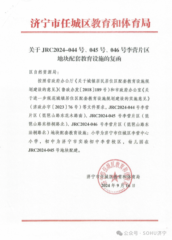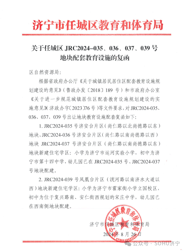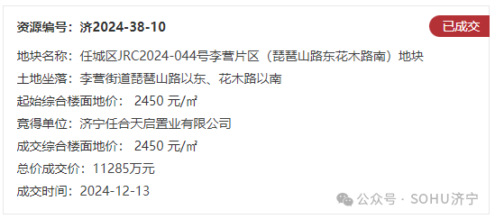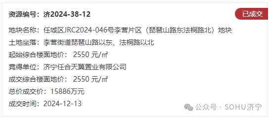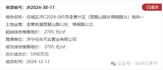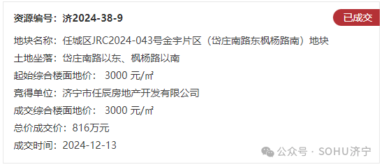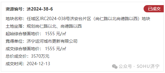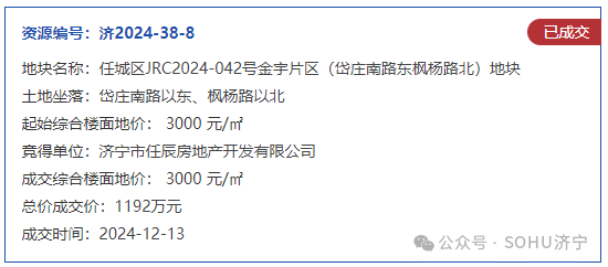 任城区政府在任城区JRC2024-042号金宇片区(岱庄南路东枫杨路北)地块中回购商业用房用于安置黎寨村,以3100元/平方米价格回购安置商业用房约3600平方米。受让人签订出让合同时一并与任城区政府签订回购协议。