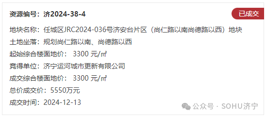 地块四:任城区JRC2024-036号济安台片区(尚仁路以南尚德路以西)地块【济宁运河城市更新有限公司竞得】