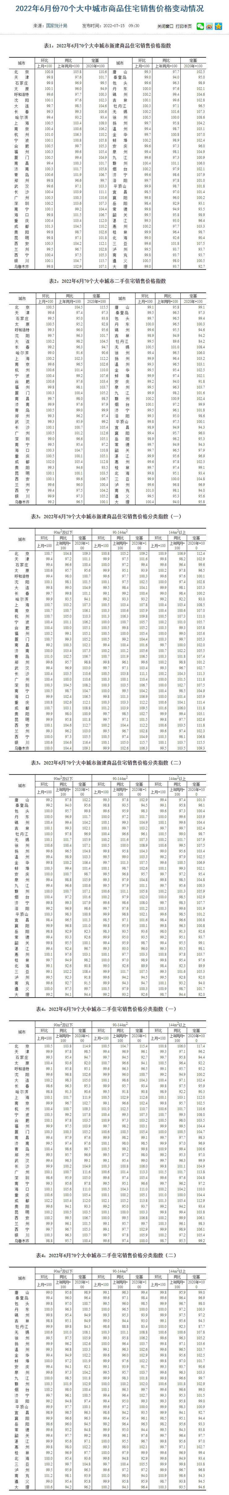 2022年6月份,70个大中城市商品住宅销售价格环比总体趋稳,环比上涨城市个数增加,同比继续走低,同比上涨城市个数减少。
