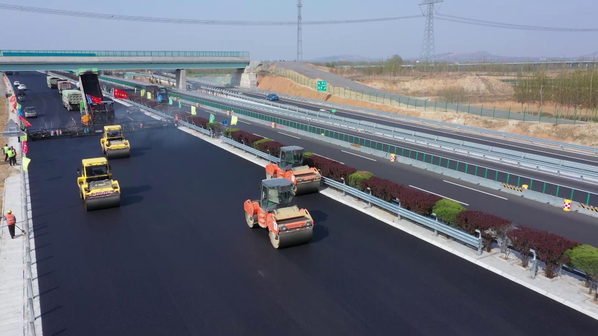 京台泰枣段改扩建项目四标段位于济宁邹城,目前部分路段路面只完成了下面层的铺设,接下来将会进行的就是中面层和上面层的铺设,铺设的厚度大约十公分。