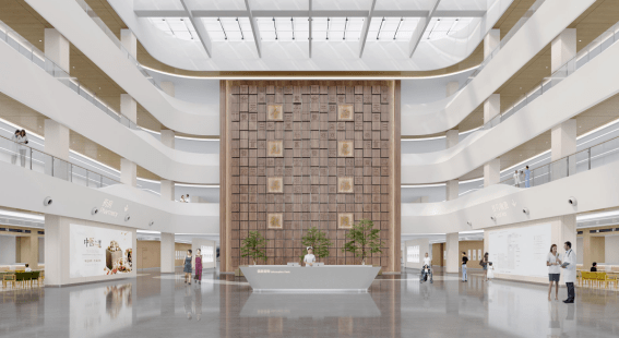 项目建筑设计采用新中式风格,融合了儒家文化、运河文化等济宁地方文化特色和中医元素。建筑主体以“运河”为意向,水平线条宽窄变幻,婉转流动富有现代的美感。室内装饰装修以人为本、绿色环保的装修理念贯穿门诊大厅、医疗主街、住院大厅等各个空间。简约现代的装修风格为患者提供温馨、舒适、健康、充满人文气息的诊疗环境,彰显了浓郁的地域文化和中医文化。