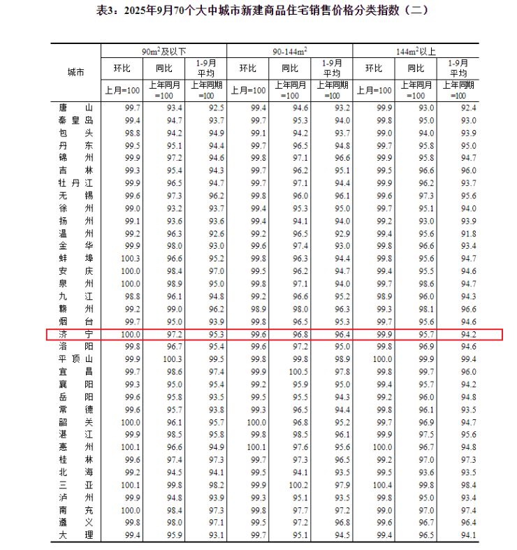 搜狐网济宁小编注意到:今早9点30分,国家统计局发布了2025年9月份70个大中城市商品住宅销售价格变动情况统计数据。2025年9月份济宁新建商品住宅销售价格环比下降0.3个百分点。