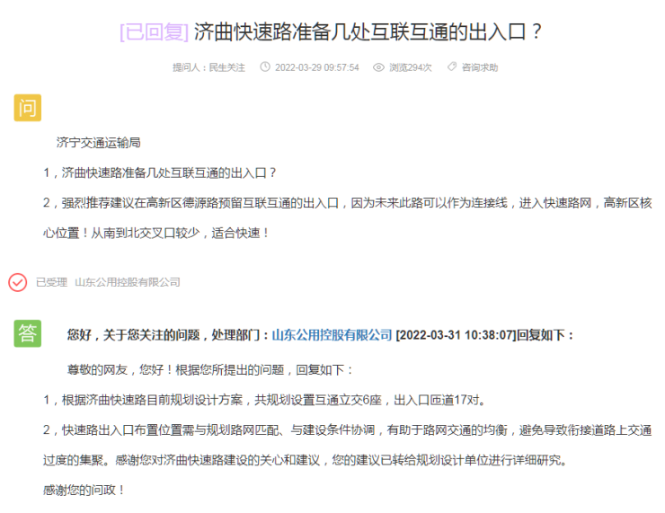 近日,搜狐网济宁小编在济宁市网络问政平台上注意到有有网友提问:济曲快速路准备几处互联互通的出入口?建议在高新区德源路预留互联互通的出入口