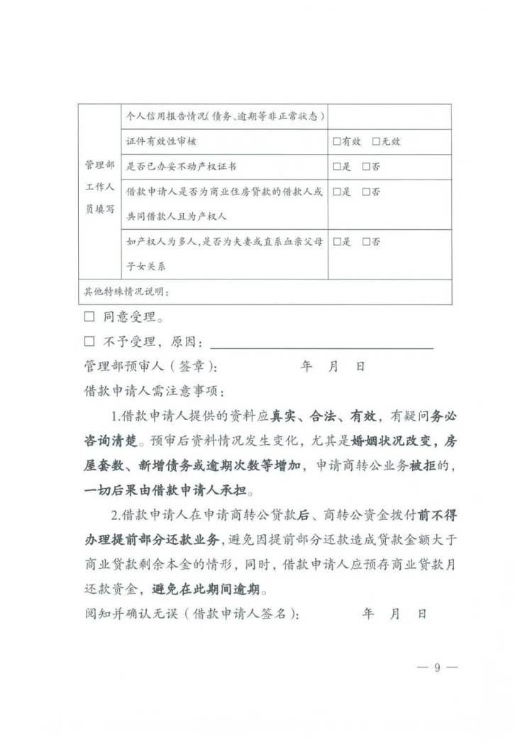 选择带押转贷或带押转组合模式的,借款申请人应向商业贷款银行征求意见,商业贷款银行同意的,携带《商转公银行意见书》(附件2)向中心或中心贷款业务合作行申请办理商转公贷款,经审核确认具备商转公贷款资格的,中心或中心贷款业务合作行应出具《商转公贷款预审确认单》(附件1)。