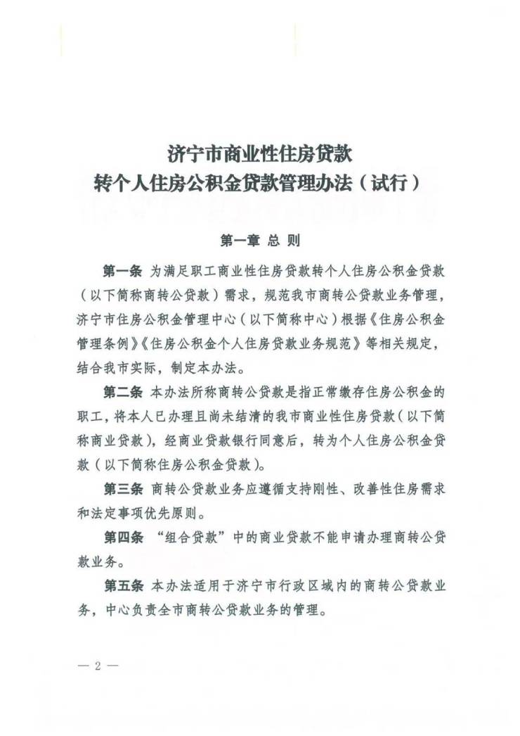第一条 为满足职工商业性住房贷款转个人住房公积金贷款(以下简称商转公贷款)需求,规范我市商转公贷款业务管理,济宁市住房公积金管理中心(以下简称中心)根据《住房公积金管理条例》《住房公积金个人住房贷款业务规范》等相关规定,结合我市实际,制定本办法。