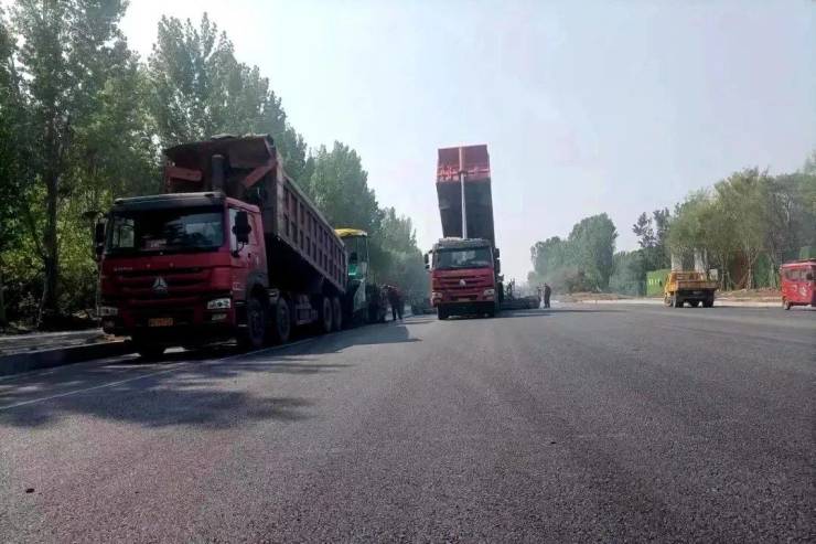 4月22日起,在道路路面上,满载着沥青的运输车不断开来,依次倾倒在大型摊铺机上。随着大型摊铺机和轧道车的缓缓开过,一条笔直、宽阔、黝黑、崭新的路面呈现在眼前。