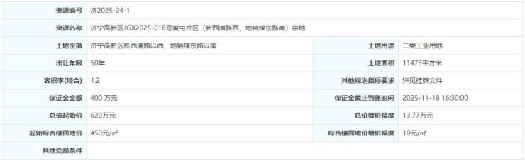 土地位于:济宁高新区新西浦路以西、地销煤东路以南;土地面积:11473㎡(约17亩);土地用途:二类工业用地;出让年限:50年;容积率不小于1.2;起始价:620万元,综合楼面价起价:450元/㎡;最终成交价为:620万元(约36万元/亩),综合楼面地价成交价:450元/㎡;溢价率:0.0%;