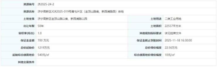土地位于:济宁高新区金顶山路以南、新西浦路以西;土地面积:22557㎡(约34亩);土地用途:二类工业用地;出让年限:50年;容积率不小于1.0;起始价:1219万元,综合楼面价起价:540元/㎡;最终成交价为:1219万元(约36万元/亩),综合楼面地价成交价:540元/㎡;溢价率:0.0%;