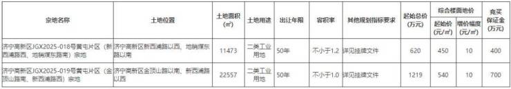 从2宗地块的具体分布上看,均位于济宁高新区。从土地用途来看,均为二类工业用地。土地总面积为34030㎡,约51亩;起始价为1839万元。