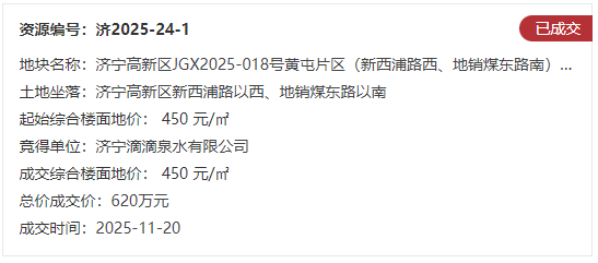 地块一:济宁高新区JGX2025-018号黄屯片区(新西浦路西、地销煤东路南)宗地【济宁滴滴泉水有限公司竞得】