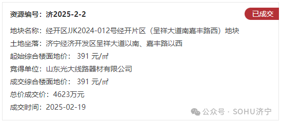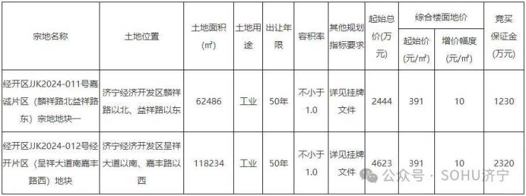 土地位于:济宁经济开发区麟祥路以北、益祥路以东;土地面积:62486㎡(约94亩);土地用途:工业用地;出让年限:50年;容积率不小于1.0;起始价:2444万元,综合楼面价起价:391元/㎡;最终成交价为:2444万元(约26万元/亩),综合楼面地价成交价:391元/㎡;溢价率:0.0%;