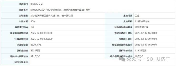 土地位于:济宁经济开发区呈祥大道以南、嘉丰路以西;土地面积:118234㎡(约177亩);土地用途:工业用地;出让年限:50年;容积率不小于1.0;起始价:4623万元,综合楼面价起价:391元/㎡;最终成交价为:4623万元(约26万元/亩),综合楼面地价成交价:391元/㎡;溢价率:0.0%;