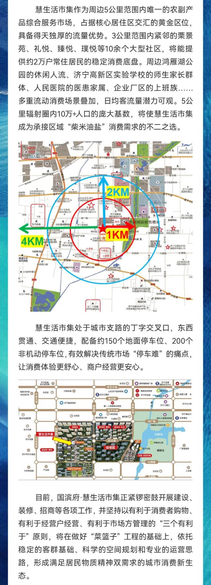 作为区域内民生商业集合地,慧生活市集坐落于国滨府·璞悦商业街北侧,共分两层,一层2523平方米的市场经营区里,24间676平方米外围独立商铺与1650平方米的内部摊位形成互补,在涵盖更多农副产品品类的同时,更能拓展特色餐饮、生活服务、文创