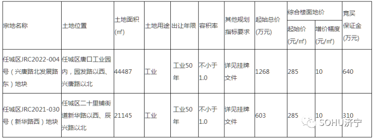济宁城区挂地!搜狐网济宁小编从济宁市自然资源和规划局了解到:经济宁市人民政府批准,济宁市自然资源和规划局决定以网上挂牌方式出让任城区2宗国有建设用地使用权,土地用途为工业用地;土地面积65632㎡,约98.45亩;起始价为1871万元;经竞价后,最终成交价为1871万元。