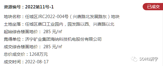地块一:任城区JRC2022-004号(兴唐路北发展路东)地块【济宁矿业集团海纳科技机电股份有限公司竞得】