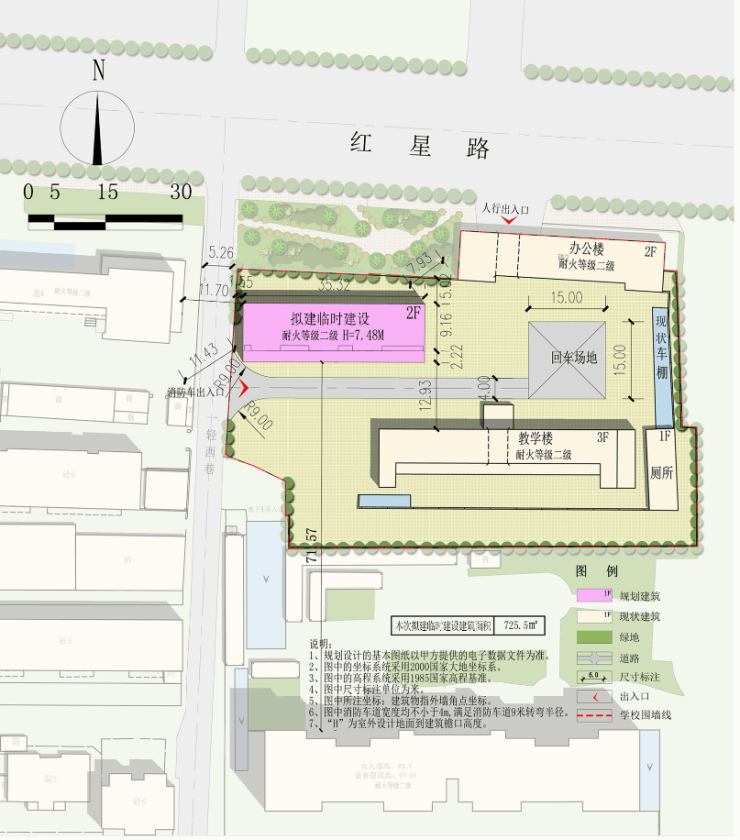 建设规模:拟建临建项目位于济宁市实验小学红星校区内地块西侧,建筑面积725.5平方米,建筑层数2层,建筑高度7.48米,建筑结构为钢结构。